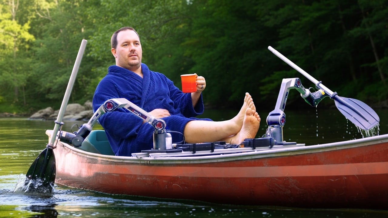 Il trucco geniale di Dave sta nell’aver capito una cosa semplice: la navigazione di una canoa funziona esattamente come la trazione differenziale di un carro armato. Quando un cingolo gira più veloce dell’altro, il veicolo sterza. Allo stesso modo, quando un braccio robotico rema più intensamente dell’altro, l’imbarcazione cambia direzione. Una “rivelazione” che ha trasformato una normale canoa in un veicolo autonomo controllabile con un semplice joystick.