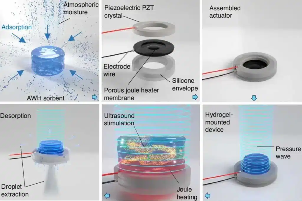 Gli ultrasuoni sono onde di pressione acustica che vibrano oltre i 20 kilohertz: invisibili, inudibili, ma fisicamente potentissimi a livello molecolare. Il team ha progettato un attuatore ultrasonico composto da un anello ceramico piatto che vibra quando riceve tensione elettrica, circondato da un secondo anello dotato di microugelli. Quando l’idrogel saturo d’acqua viene posizionato sul dispositivo, gli ultrasuoni spezzano i deboli legami idrogeno che tengono intrappolate le molecole d’acqua.