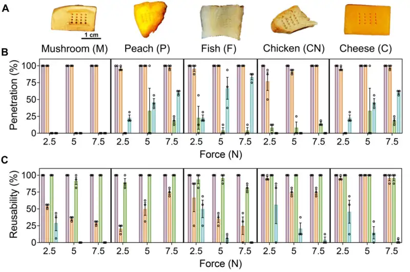 Ogni ago è sottile come un filo da cucito e lungo appena due millimetri. La dottoranda Akansha Prasad della McMaster University ha pensato che se i microaghi funzionavano per attraversare la barriera della pelle umana, avrebbero potuto funzionare anche per il cibo. Ha testato la patch su formaggio sottovuoto, funghi, pesche e perfino su quel liquido rossastro che cola dal pollo crudo. Ha funzionato ovunque.