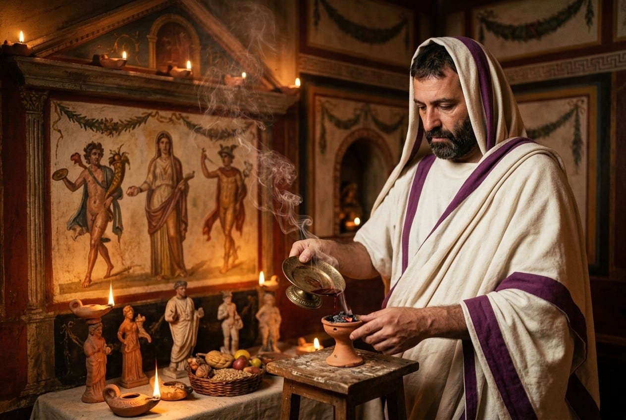 I romani avevano un nome preciso per questo rituale, come vi dicevo: praefatio. Una libagione di incenso e vino sul focolare, eseguita prima di qualsiasi sacrificio per invitare Giano, Giove e talvolta altre divinità a benedire la cerimonia. Lo descrivono Catone, Cicerone, le fonti pontificali. Lo raffigurano i rilievi del Tempio di Vespasiano, proprio a Pompei.